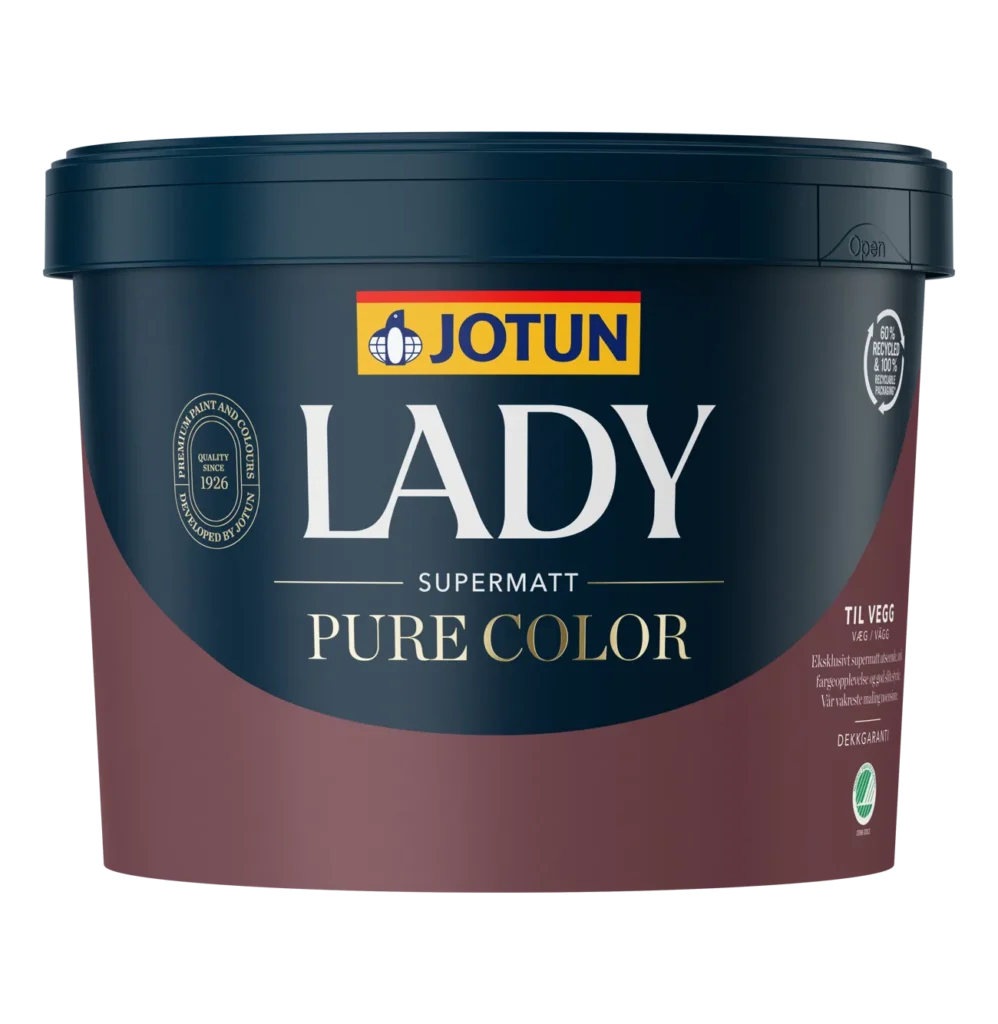 Drømmer du om vægge med et elegant, eksklusivt udtryk? Jotun Lady Pure Color er kendt som en af Jotuns smukkeste vægmalinger – og med god grund. Den ultramatte finish giver en fløjlsblød overflade, hvor farverne fremstår dybe, rene og intense, samtidig med at rummet får en rolig og harmonisk atmosfære.